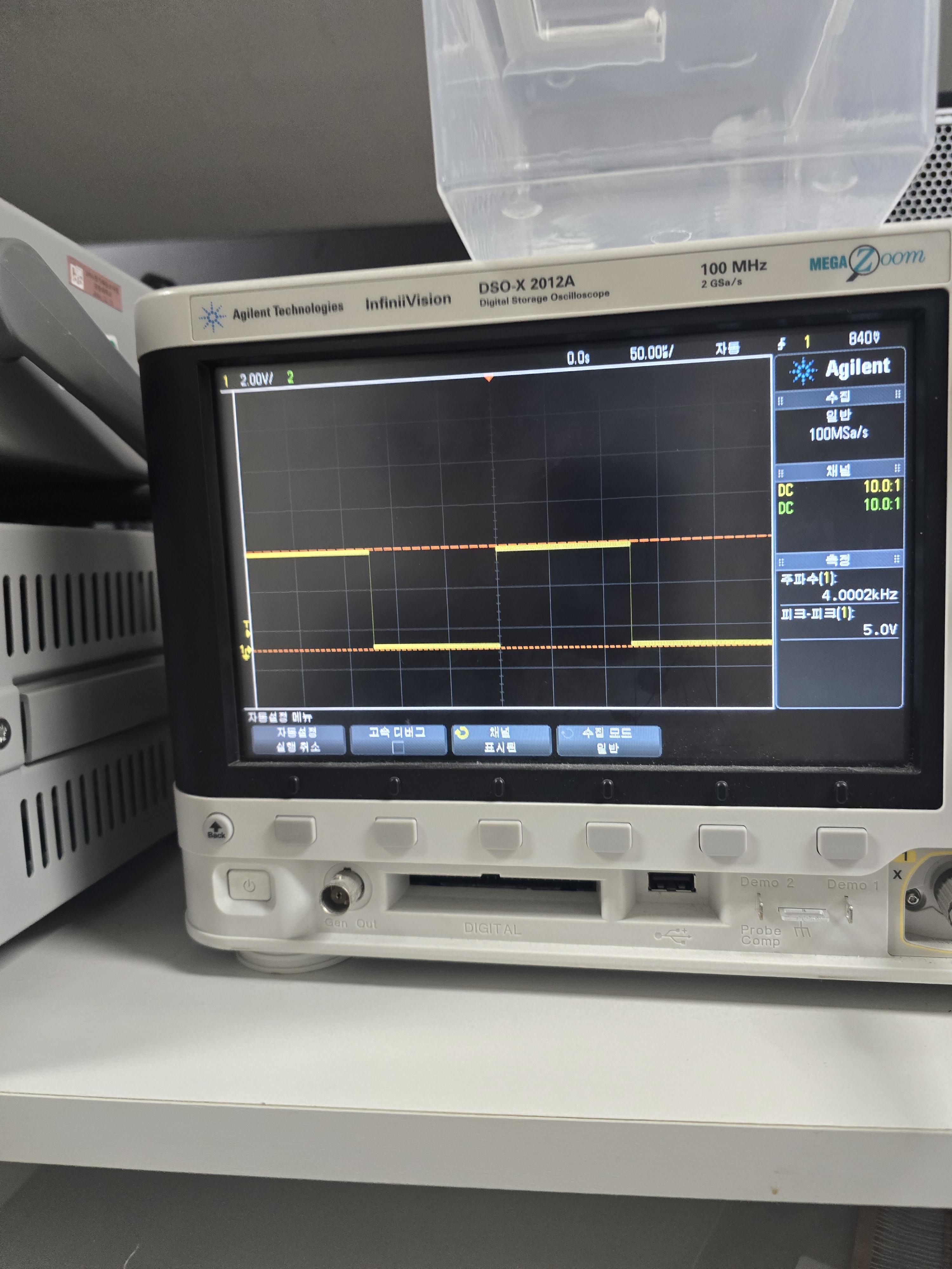 6. 예비 과제 4 번에서 작성한 코드를 실행시키고 오실로스코우프를 사용하여 PB5 핀으로 출력되는 구형파의 주파수를 측정하여라. 측정한 값이 정확하게 50 Hz인지 확인하여라.
