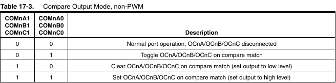 CTC mode는 compare output mode를 선택할 수 있고, table 17-3에 따라 값을 넣어주고, interrupt가 활성화되지 않으므로 수동적으로 compare match interrupt flag가 set 되도록 하였다.
