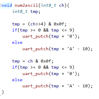AVR은 8bit MCU이므로 ASCII 코드에 해당하는 7bit를 두 개 표현할 수 있다. 임시로 함수 내에서 저장할 tmp를 선언하고, tmp의 상위 4bit의 값을 기준으로 0~9 인지 A~F인지를 판별하고, 1byte 단위로 값을 전달하므로 아스키 코드 값을 고려하여 표현했다. 두 번째는 하위 4bit를 해당하는 아스키 코드를 uart를 통해 반환하도록 하였다.