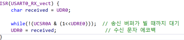 - UDR0 = UDR0 명령은 수신된 데이터(오른쪽 UDR0)를 송신 레지스터(왼쪽 UDR0)에 즉시 복사