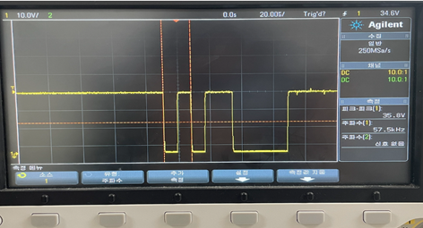 4. 다시 2 번의 코드로 복원한 후 터미널에서 엔터키를 치면 어떤 현상이 나타나는지 살펴보아라. 엔터키를칠 때 RXD0 핀 (PE0)으로 수신되는 신호를 오실로스코우프로 포착하고 수신되는 값의 ASCII 코드를 찾아라. start bit을 찾기 위해서는 트리거의 경사를 하강 에지로 선택하고 트리거 모드를 ‘Normal’로 두면 된다.일단 파형을 포착한 다음에는 cursor를 x1과 x2 사이의 거리를 1/baud rate로 설정하고 두 커서 사이의 거리가 고정된 채 함께 움직이는 모드로 설정하고 옆으로 한 비트씩 옮겨가면 각 비트의 값을 쉽게 파악할수 있다. ASCII 문자 표에서 이 ASCII 값에 대응되는 문자가 무엇인지 찾아보아라.