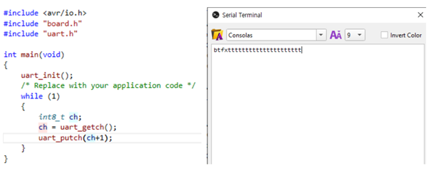 3.2 번의 코드에서 uart_putch(ch) 대신 uart_putch(ch+1)을 대입해서 실행시켜 보고 그 결과를 설명하여라.