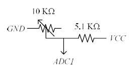 1. 아래의 회로를 구성하고 표시한 신호를 AVR 보드의 ADC1 핀에 연결하여라. ADC1에 연결하기 전에 가변 저항을 조절하면 ADC1에 연결할 신호의 전압이 변하는지 오실로스코우프로 먼저 확인하여라.