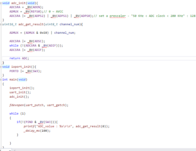 2. 예비 과제 1 번에서 작성한 adc_init() 함수를 호출하여 ADC를 초기화하여라. 물론 ADC 이외의 다른