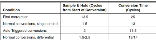 첫 변환시간은 25/125k = 200us, 이후는 13/125k = 104us이다.