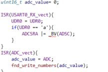 6. 사용자가 키보드의 문자 ‘a’를 누르면 그 순간 ADC 변환을 시작시키는 명령을 UART 수신 완료 ISR에 추가하여라. 그리고 AD 변환 완료 ISR에서는 변환 결과를 읽어서 FND에 출력하여라. 가변 저항을 조절하면서 ADC 입력 전압에 대응되는 정확한 값이 FND에 출력되는지 확인하여라.
