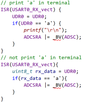 1. UDR0 = UDR0 방식은 입력 문자가 화면에 표시되어 사용자가 입력을 확인할 수 있지만, UDR0를 여러 번 읽어 데이터가 불안정