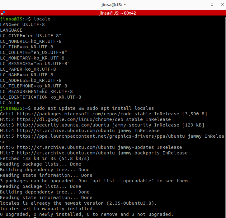 - 시스템의 기본 로케일을 en_US.UTF-8로 설정