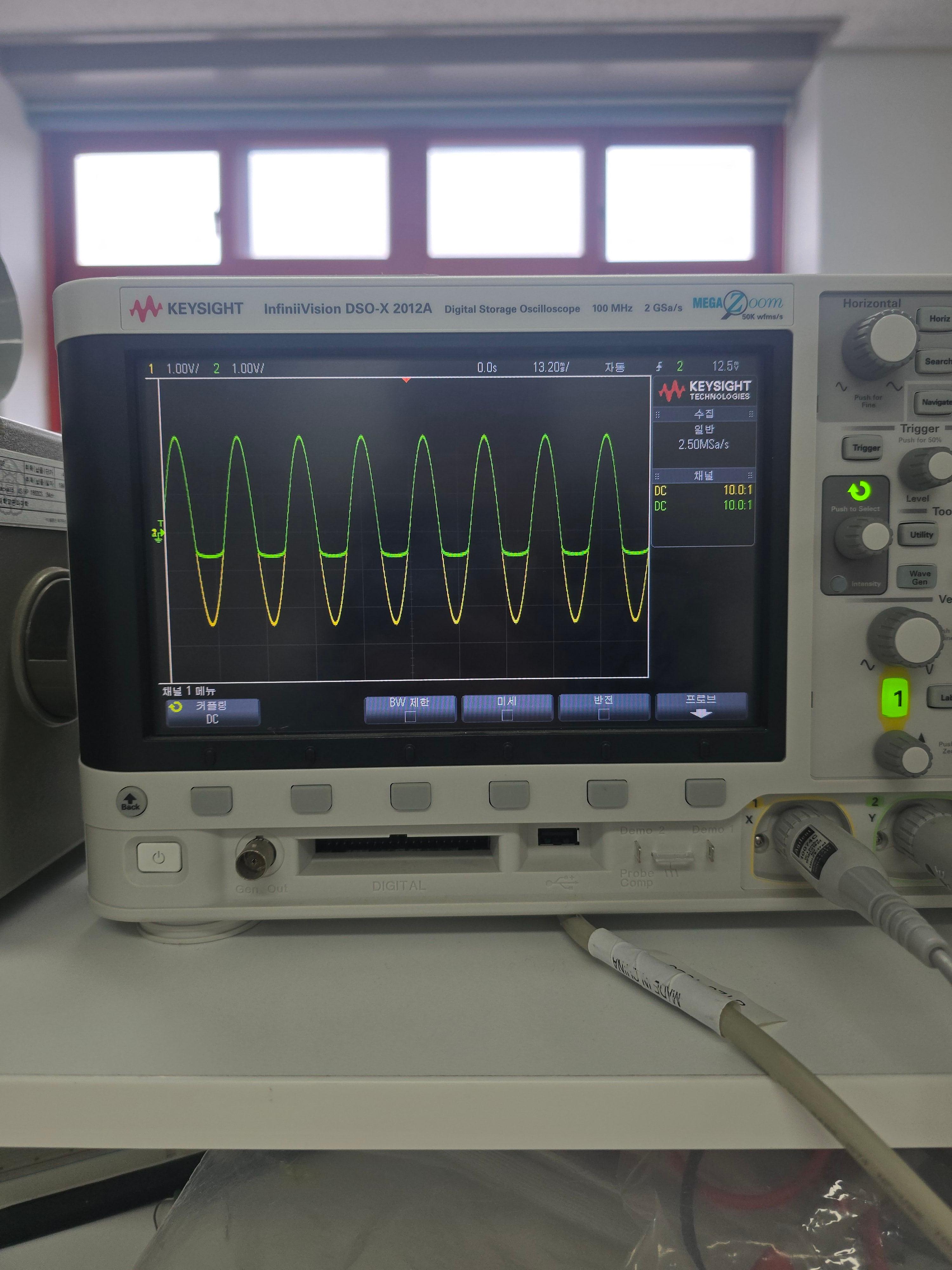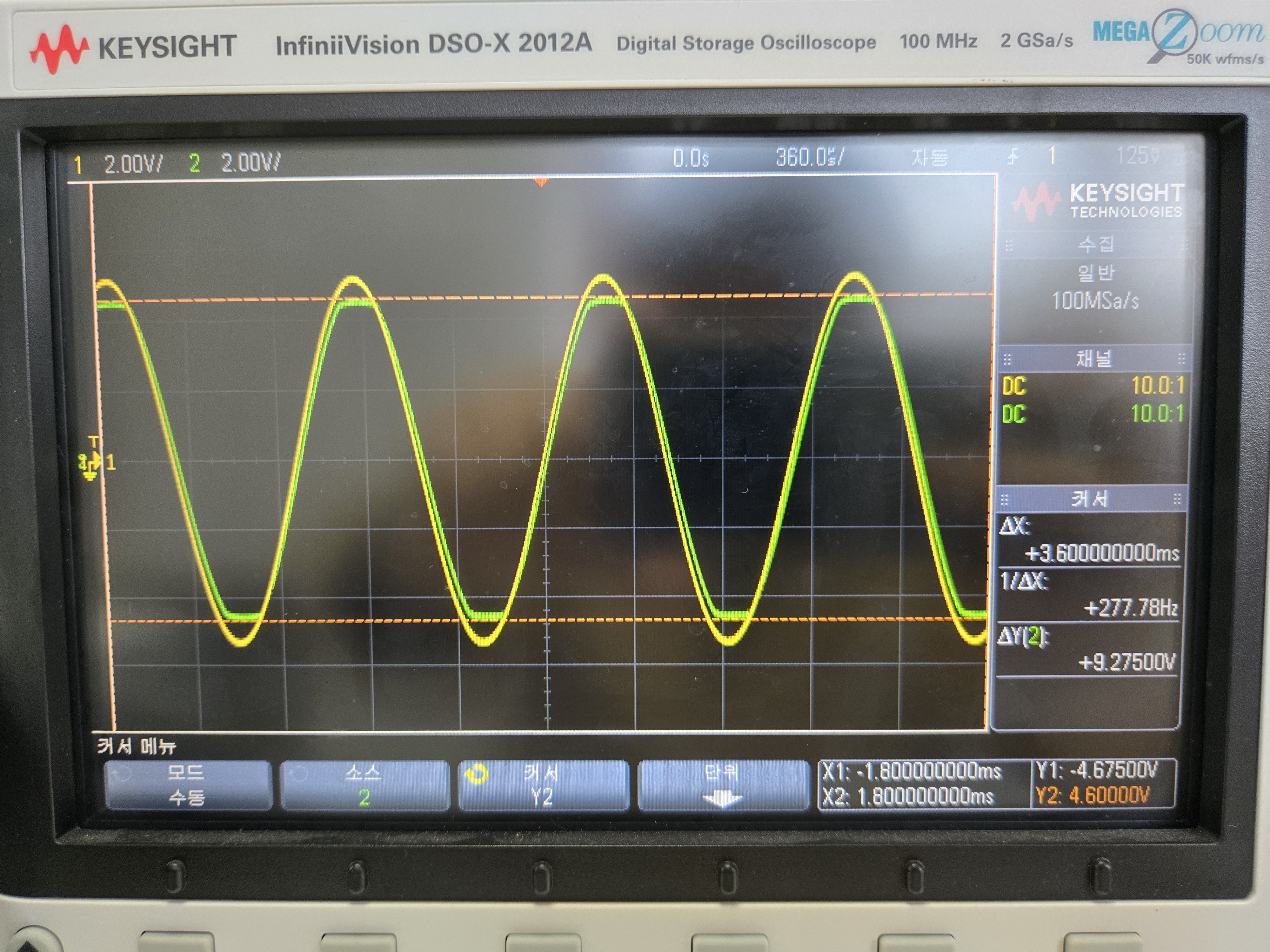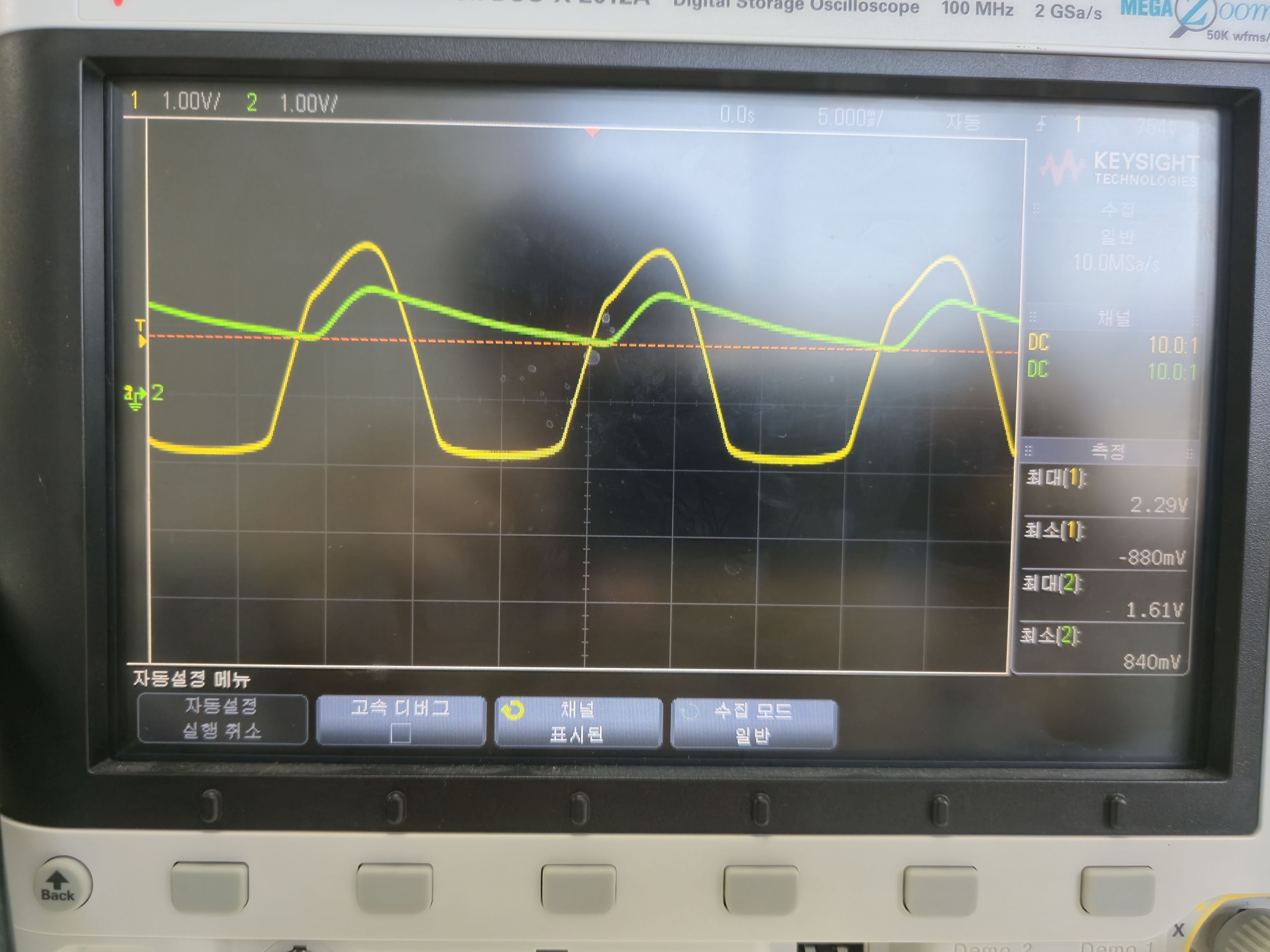 ※ 주의 : 같은 오실로스코프로 측정하면 같은 접지로 측정하게 되면 V_in의 파형의 음의 방향이 사라진다.