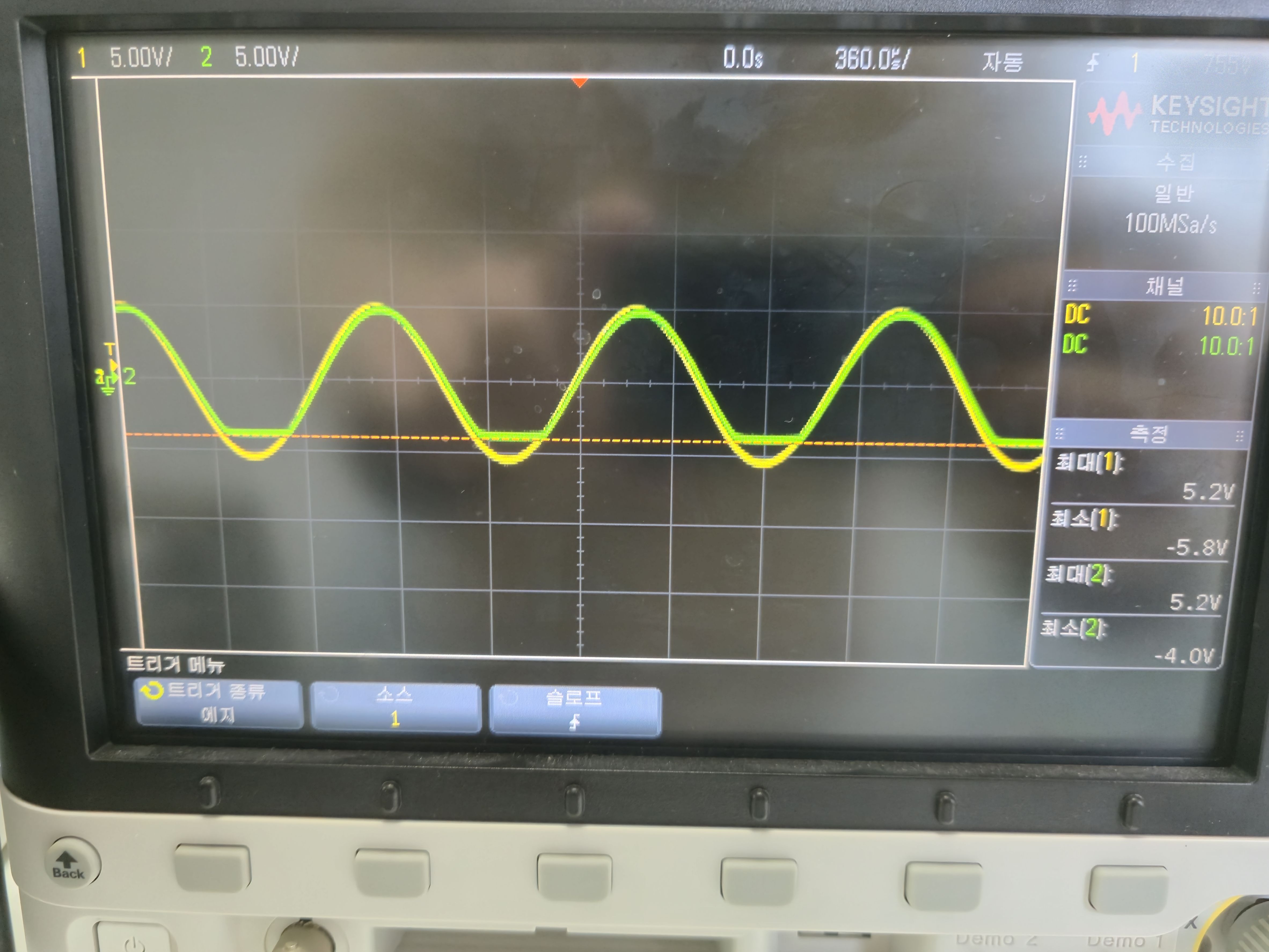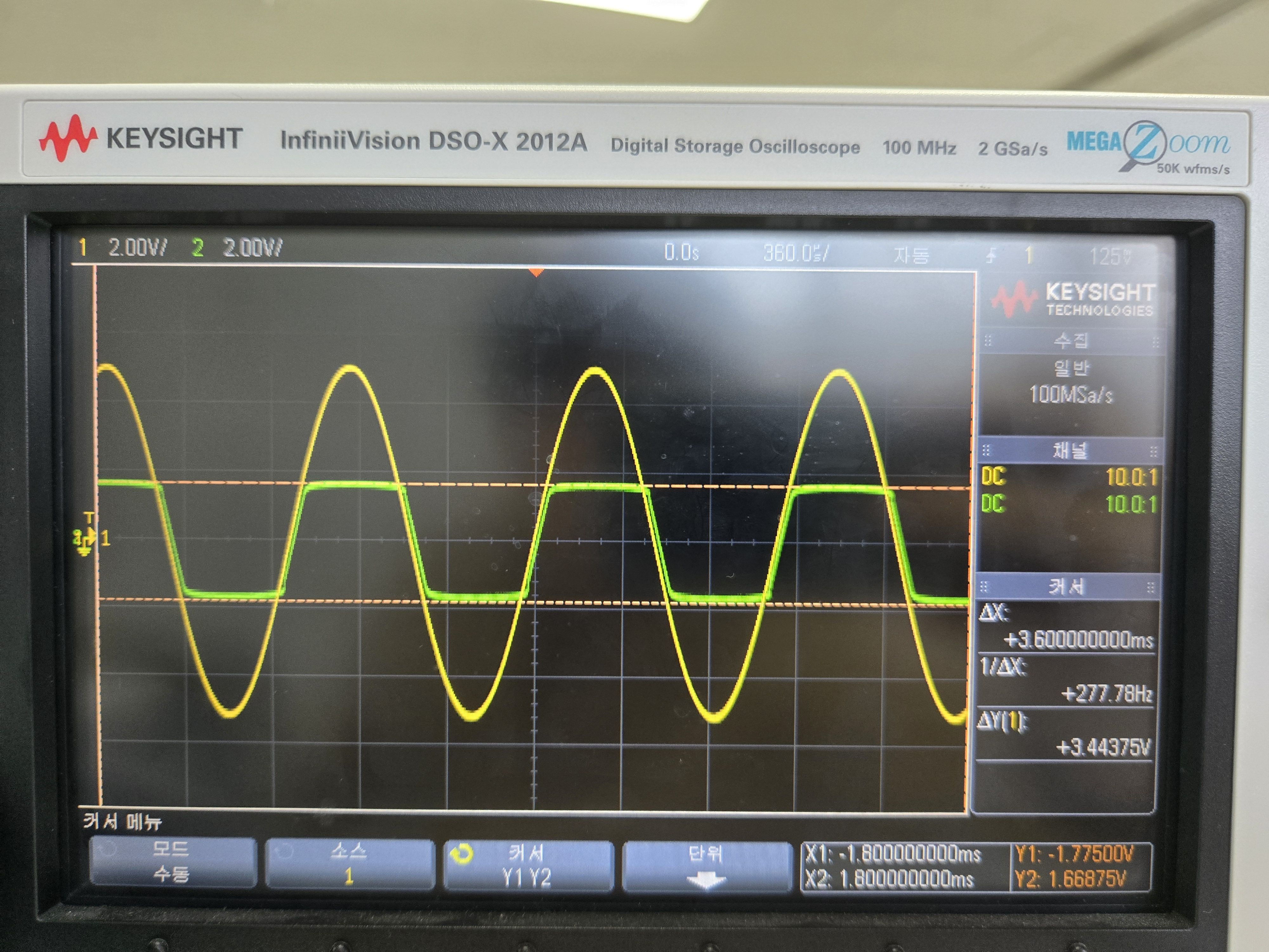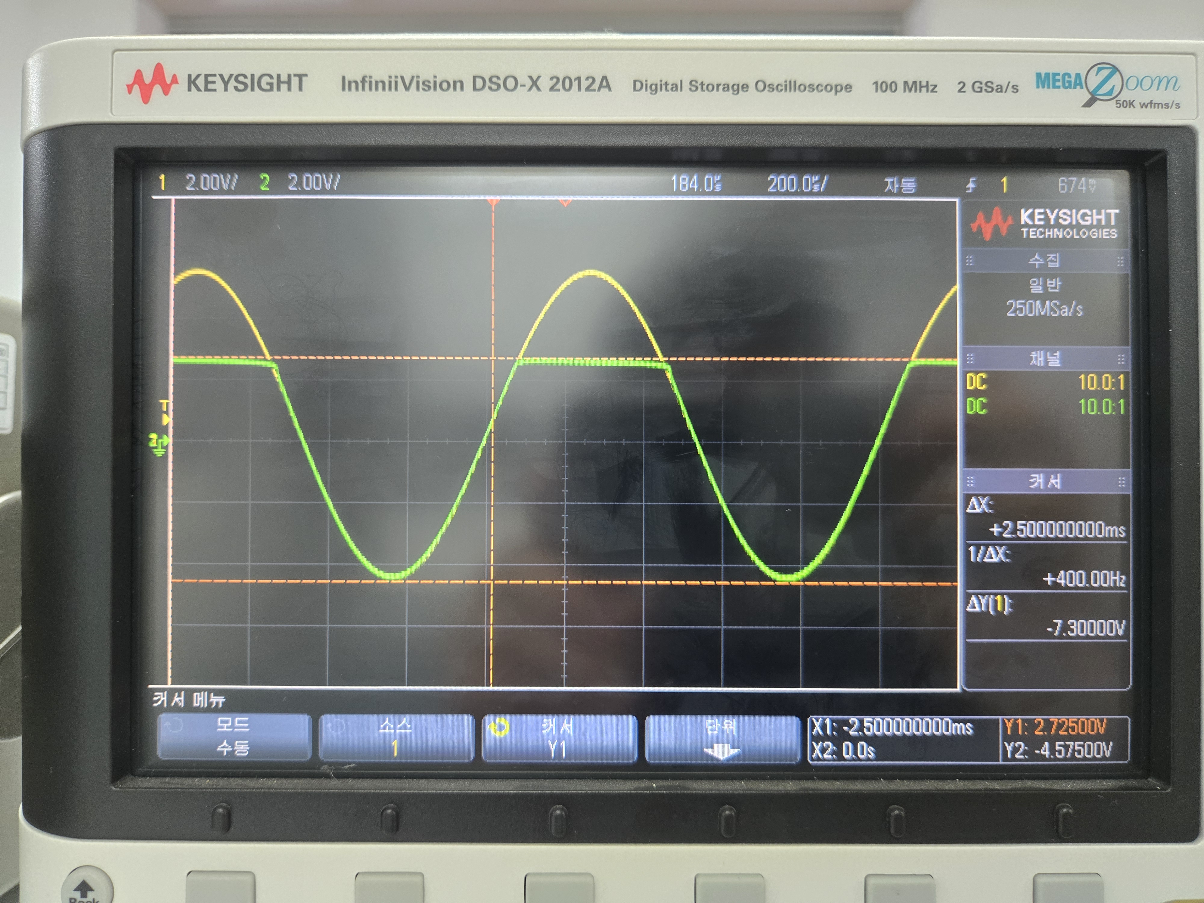 ※ 주의 : 같은 오실로스코프로 측정하면 같은 접지로 측정하게 되면 V_in의 파형의 음의 방향이 사라진다.
