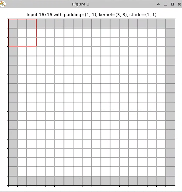 - padding1로 18 *18로 만든 후 한 칸씩(stride =1) Conv2D 진행 => 16*16 tensor 생성