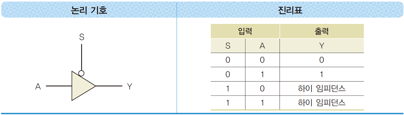 - S는 제어용 입력 단자, S가 1이 되면 회로가 폐쇄되어 출력이 High- impedance 상태가 됨
