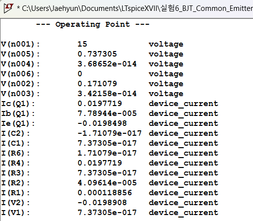 | 컬렉터-이미터 바이어스 전압 V_CEQ | .OP(BIAS) 해석 결과에서 측정 | |