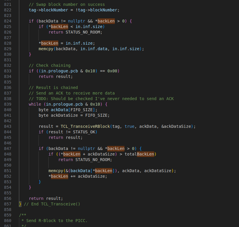 /home/tspoon/workspace/libraries/MFRC522/src/MFRC522Extended.cpp: In member function 'MFRC522::StatusCode MFRC522Extended::TCL_Transceive(TagInfo*, byte*, byte, byte*, byte*)':