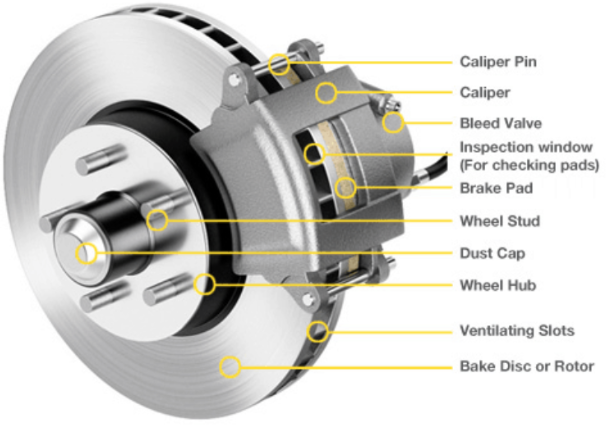 차량을 제동하는 역할을 합니다. 일반적으로 디스크 브레이크 또는 드럼 브레이크가 사용됩니다.
