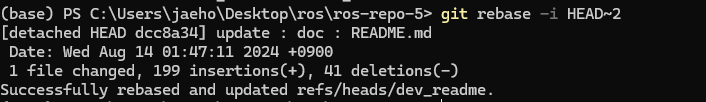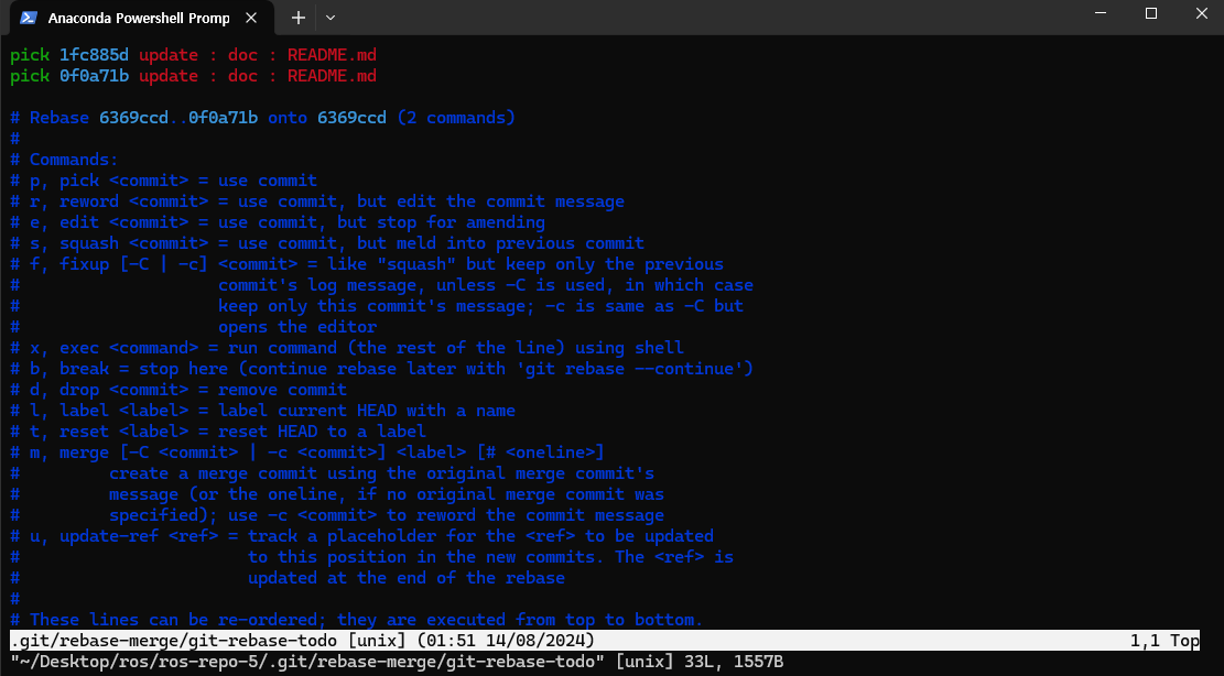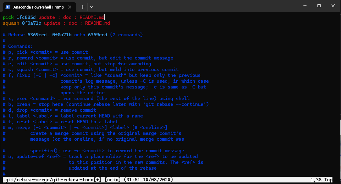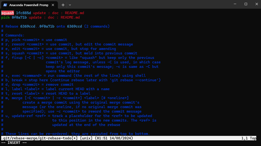 첫 번째 커밋의 앞에는 pick을 그대로 두고, 두 번째 커밋의 앞에는 squash (또는 s)를 입력합니다. 이를 통해 두 번째 커밋이 첫 번째 커밋에 합쳐지게 됩니다