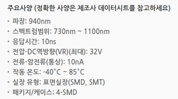 - 최대 감도: 850nm (가시광선에서 높은 감도)