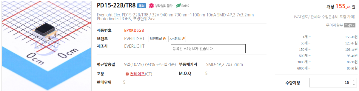 - **녹색 레이저 (532nm)**를 사용할 경우, Everlight PD15-22B/TR8이 최적입니다. 이 포토다이오드는 녹색 파장에 높은 민감도를 보이므로 정확한 감지가 가능합니다.