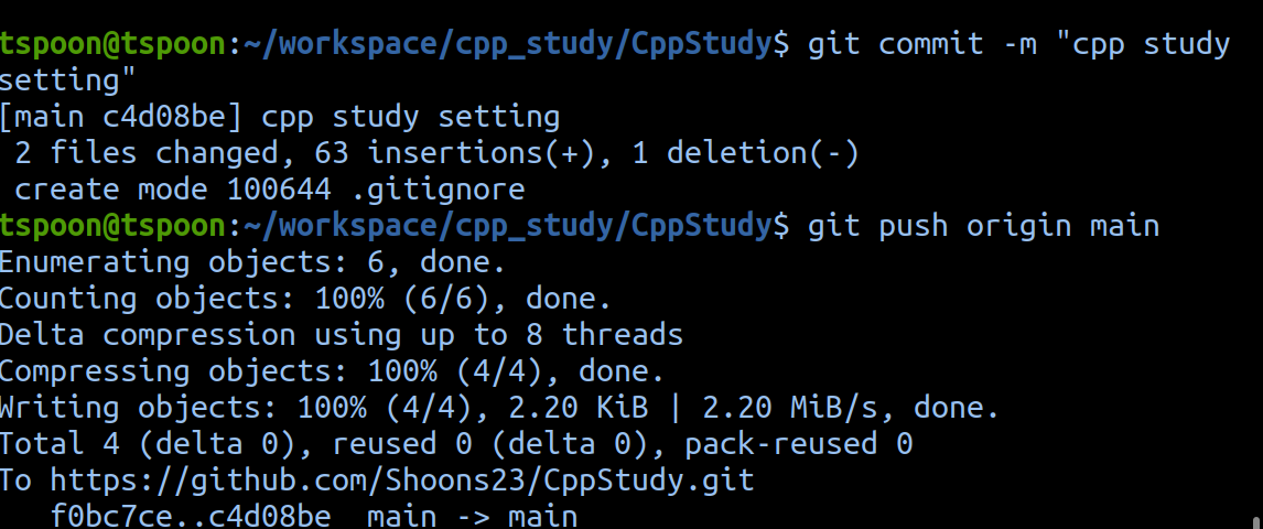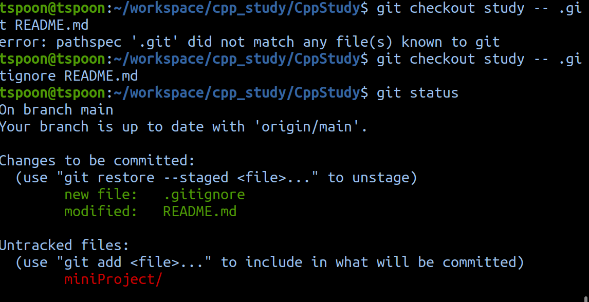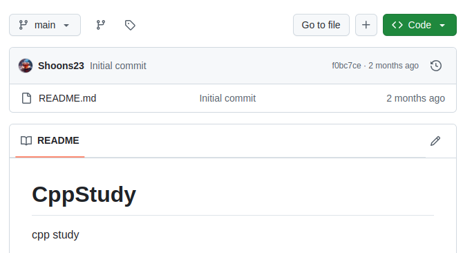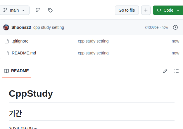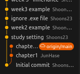 7. 이제 기존에 study 브랜치에서 .gitignore과 readme file만 main 브랜치에 업로드