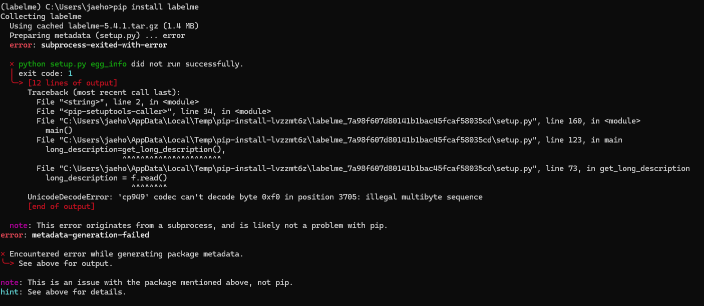 File "C:\Users\jaeho\AppData\Local\Temp\pip-install-lvzzmt6z\labelme_7a98f607d80141b1bac45fcaf58035cd\setup.py", line 123, in main