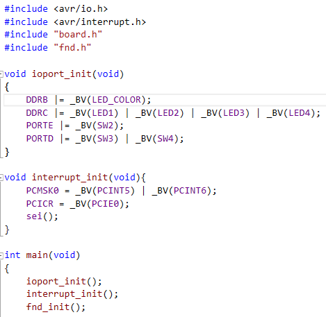 3. 실험 5에서는 외부 인터럽트 INT3과 INT7을 사용했지만 이번 실험에서는 이 인터럽트를 사용하지 않고 PCINT만을 사용할 것이다. interrupt_init() 함수에서 PCINT을 사용하기 위한 설정을 하려고 한다. ATmega1281의 PB5와 PB6은 PCINT5와 PCINT6 입력으로 사용할 수 있다. 이를 위하여 아래 함수를 완성하고 그 내용을 설명하여라.