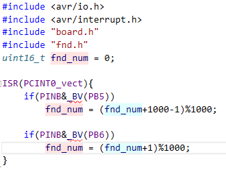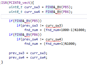 6. interrupt_init() 함수에서 PCINT0를 활성화시켰으므로 이제 스위치 SW3이나 SW4 둘 중 하나라도 상태가 변하면 PCINT0가 발생한다. 그러므로 PCINT0를 위한 ISR이 필요하다. 우선 SW3을 누를 때마다 FND에 표시된 값을 1씩 증가시키는 일을 하도록 ISR을 작성하여라. FND에 표시된 값이 999라면 그 다음은 0이 되어야 한다. 이 일을 하기 위해서는 어떤 원인에 의해서 PCINT0가 발생했는지 ISR에서 찾아야 한다. PCINT의 ISR에서 PINB 레지스터를 읽어서 그 값으로부터 PCINT0를 발생시킨 원인을 찾을 수 있다. SW3 스위치가 떼어지는 순간에는 FND에 표시된 값에 아무런 변화도 없어야 한다.
