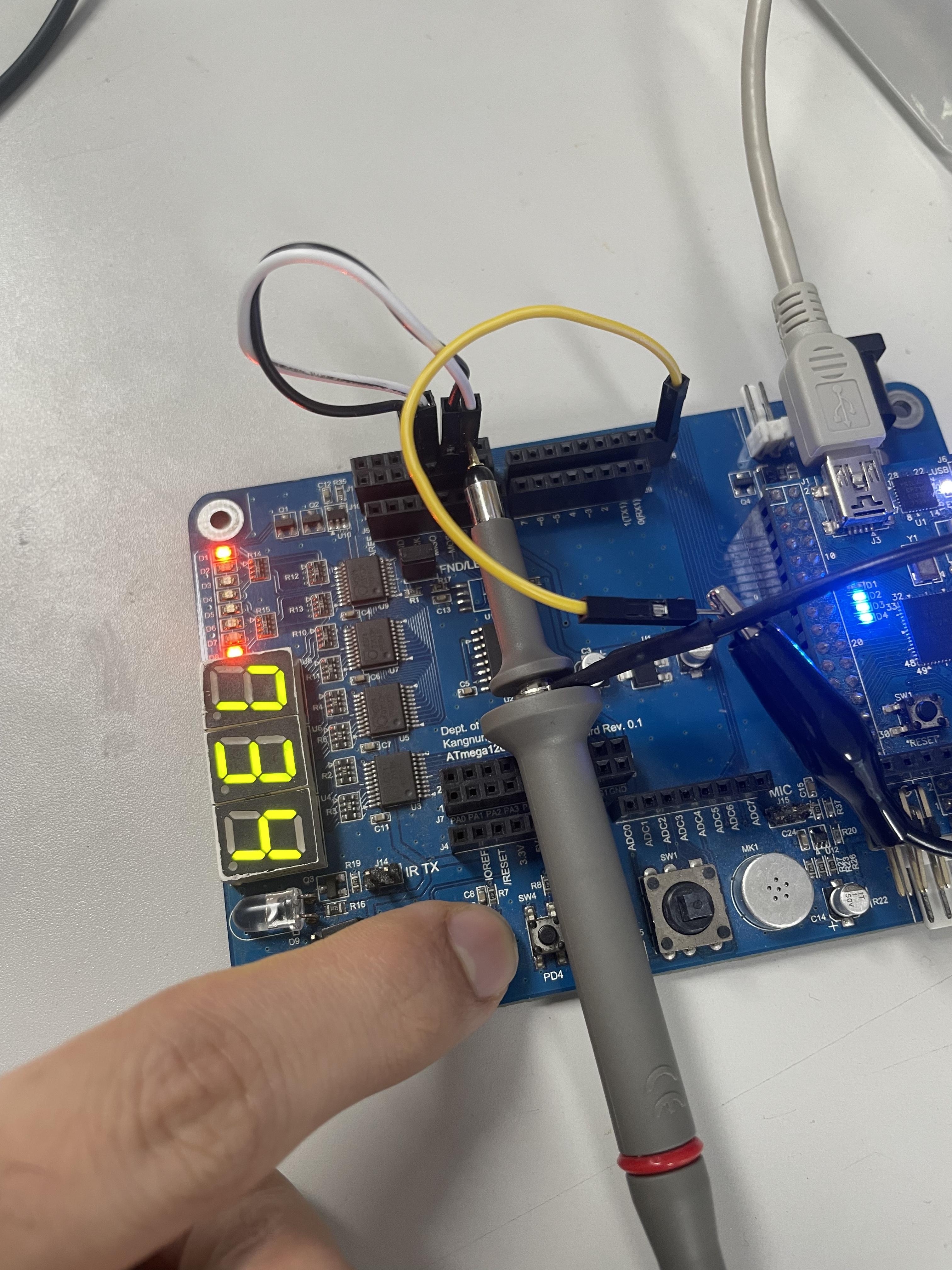 8. 7 번까지 기능 확인을 마쳤다면 이제 SW3과 SW4를 여러 차례 누르면서 스위치를 한 번 누를 때마다 FND에 표시된 값이 정확하게 1씩 변하는지 확인해 보아라. SW3을 눌렀다 뗐을 때에는 FND에 표시된 값이 정확하게 1씩 증가하지만 SW4를 눌렀다 뗐을 때에는 FND에 표시된 값이 2 이상 감소하는 것을 종종 볼 수 있을 것이다. 이 때 상황을 좀 더 자세하게 관찰해 보면 SW3과 달리 SW4는 스위치를 누르는 순간 외에도 스위치를 떼는 순간에도 FND 값이 감소하는 것을 확인할 수 있을 것이다. 오실로스코우프를 사용해 스위치를 떼는 순간 PB5와 PB6 pin의 전압 변화의 차이를 확인하고 왜 이런 현상이 생기는지 그 이유를 회로도를 참고하여 설명하여라. 스위치를 누르는 순간이나 떼는 순간을 포착하기 위해서는 trigger mode를 Normal로 설정하고 trigger level을 0 V와 5 V 사이의 적당한 값으로 두어야 한다. Time/Div는 1 ms 정도로 두면 된다.